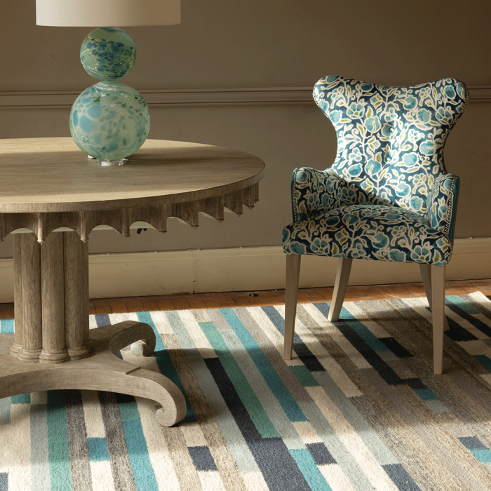 Now available in Ocean, ‘Mattone’ is a superbly smart flat woven rug made up of bands and stripes in neutral tones and highlights of indigo, ocean and denim. Made from a 100% pure wool flat weave. Available in 4 sizes ‘Mattone’ is also available in Sienna.